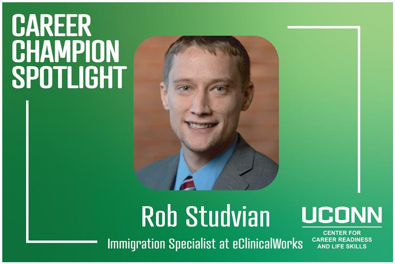 Today, Rob is a Career Champion and immigration specialist at eClinicalWorks, a healthcare IT company helping modernize medical practices across the country. His job involves more than hiring; he advocates for employees navigating work visas, mentors young professionals, and partners with institutions like UConn to share real-world hiring advice students won’t find in a textbook.