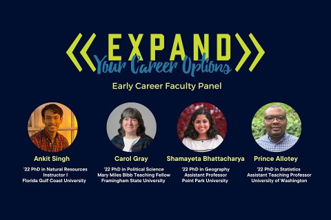 The Expand Your Career Options event hosted four panelists, all of whom are completing their first year of a faculty position beyond UConn. Here they shared their experiences and gave advice for those interested in following a similar path.
